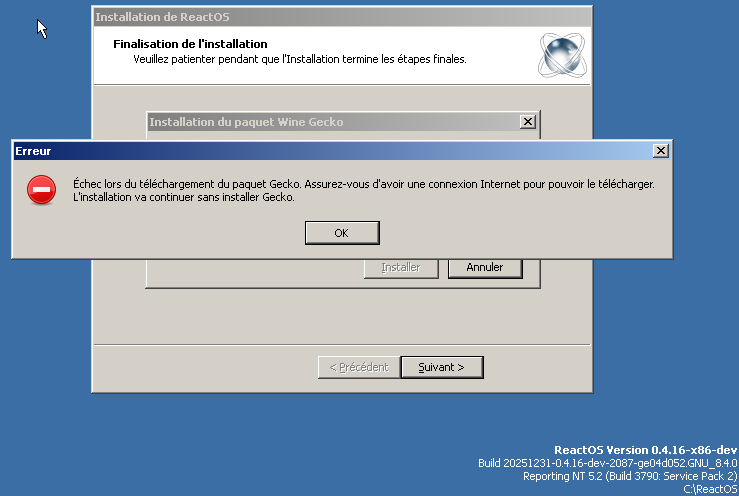 err:(win32ss/user/user32/windows/messagebox.c:1048) MessageBox: L"\00c9chec lors du t\00e9l\00e9chargement du paquet Gecko. Assurez-vous d'avoir une connexion Internet pour pouvoir le t\00e9l\00e9charger. L'installation va continuer sans installer Gecko."